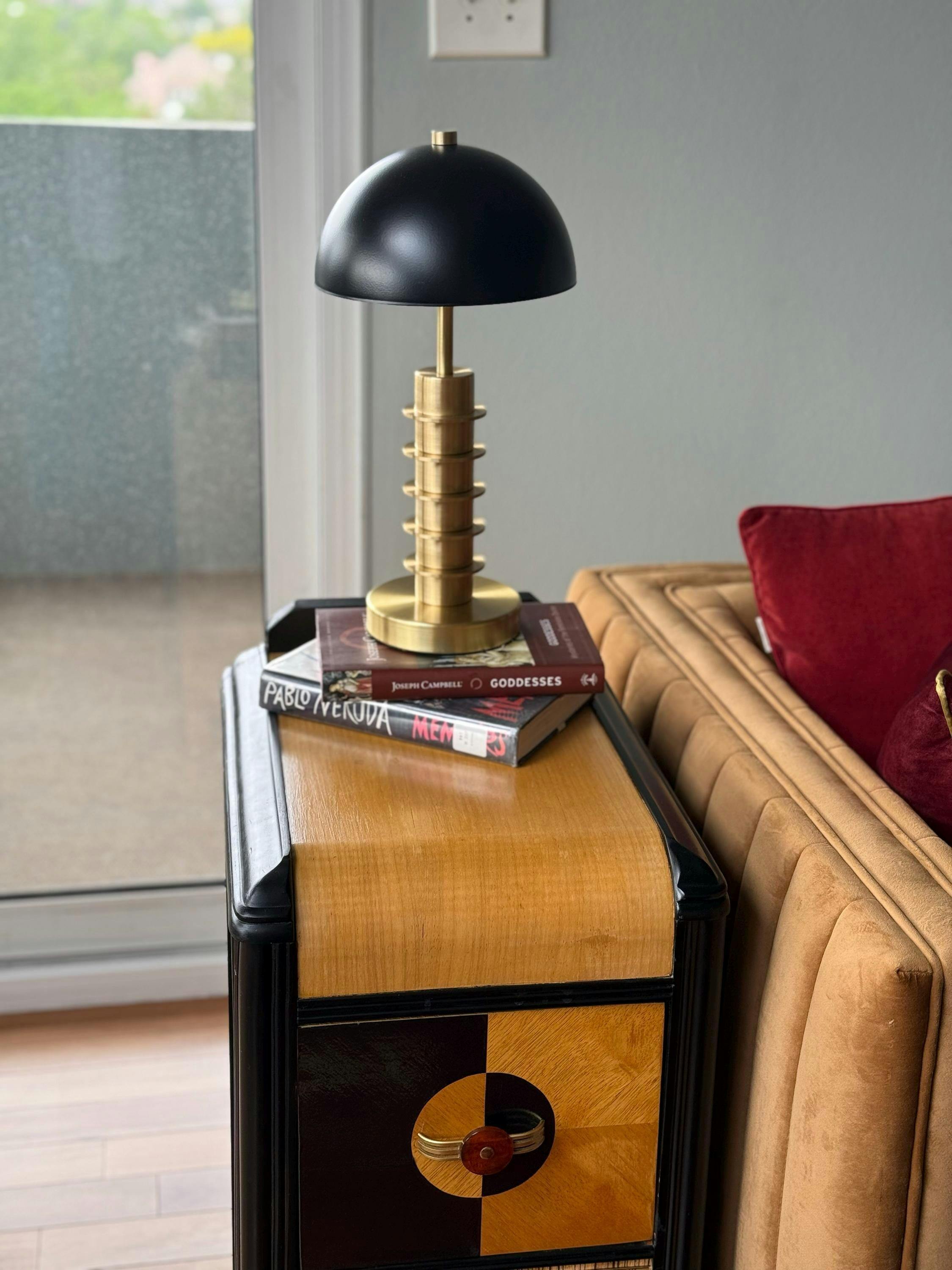 Bring a touch of modern Art Deco elegance to your space with this striking table lamp. Featuring a sculpted brushed-gold base, a sleek matte-black dome shade, and clean geometric lines, it delivers warm, focused light while doubling as a bold design statement on any desk, nightstand, or console table. DIMENSIONS
