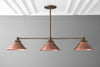 This in-line chandelier features your choice of finish on the drop and supporting arms with copper cone shades.